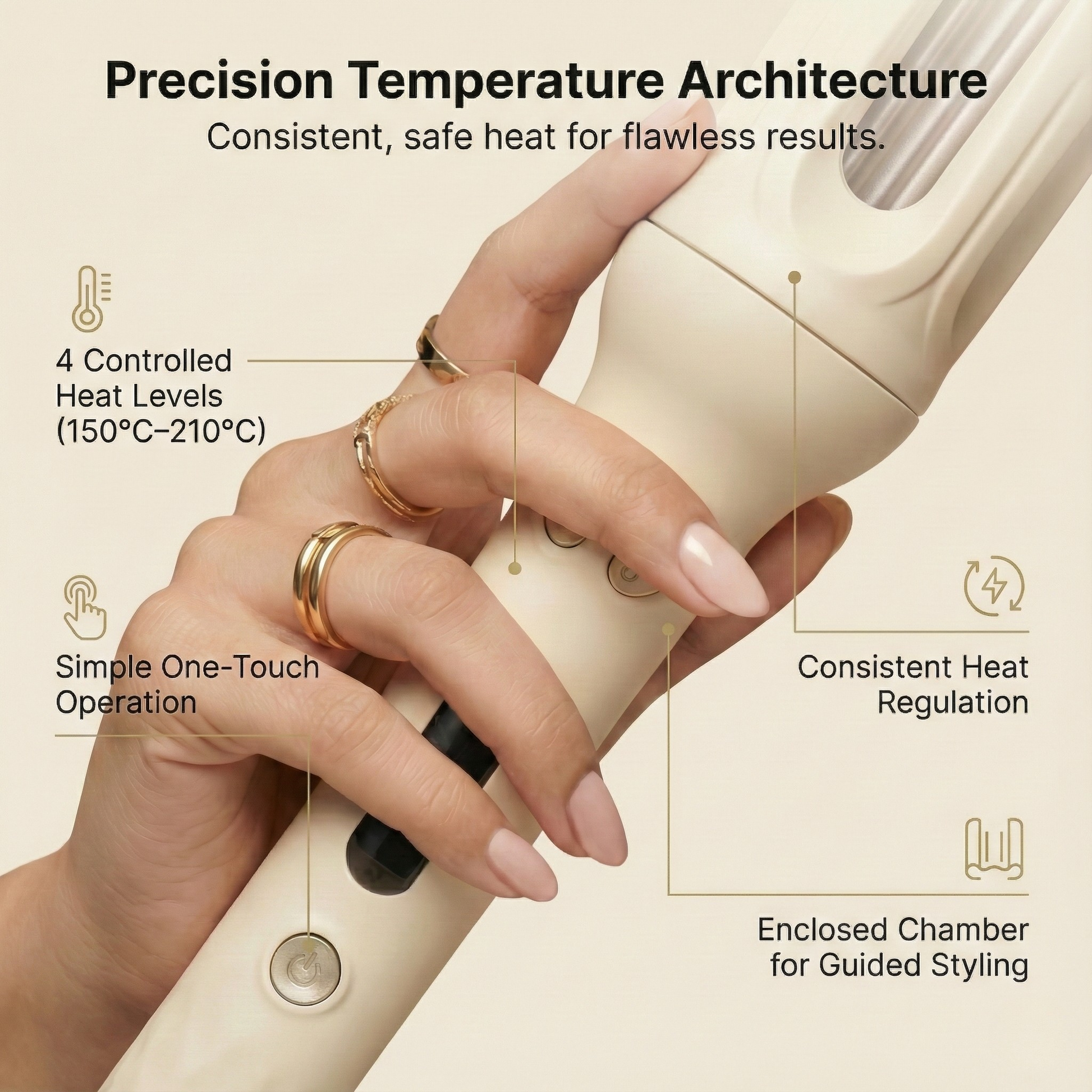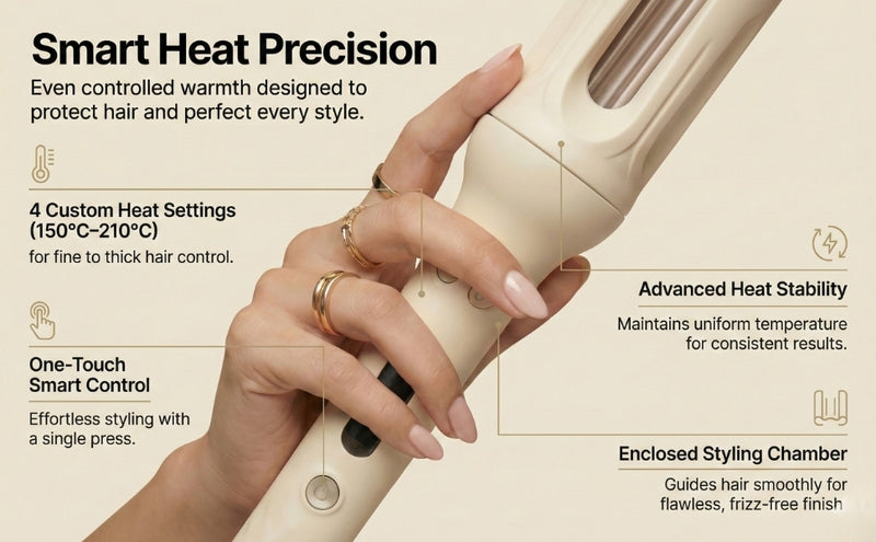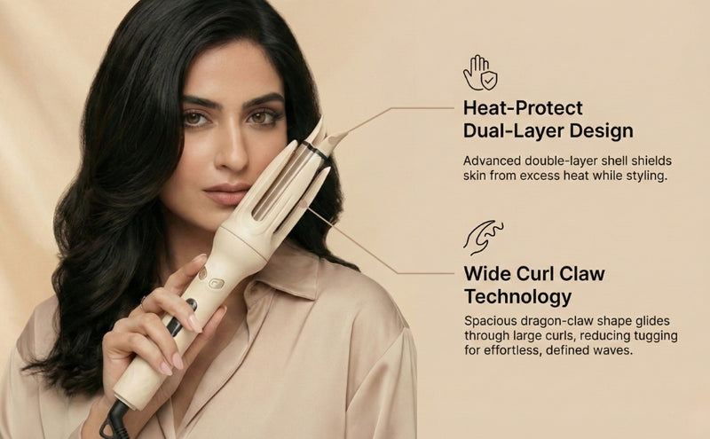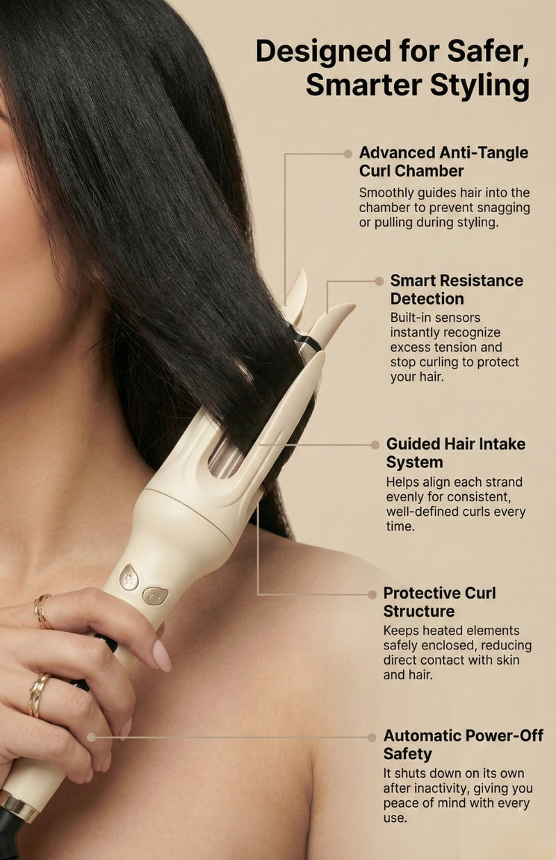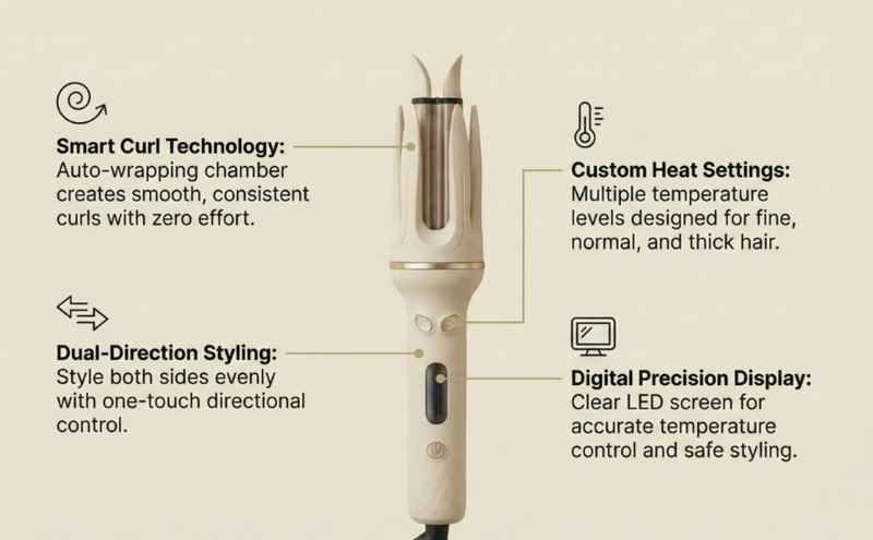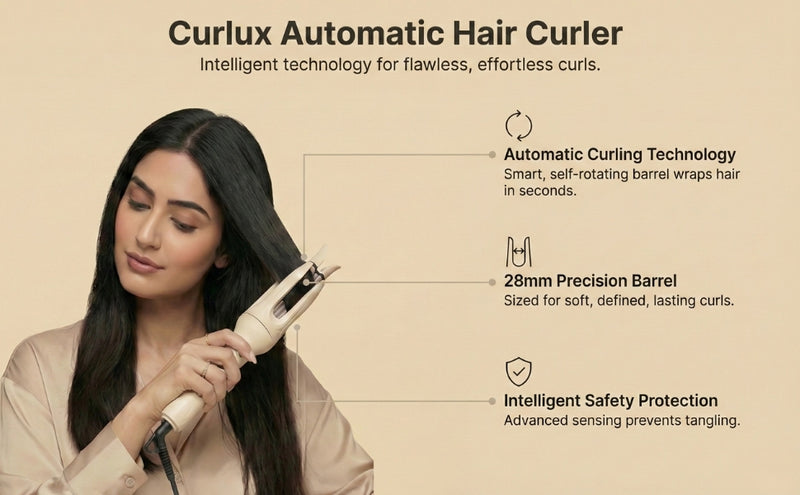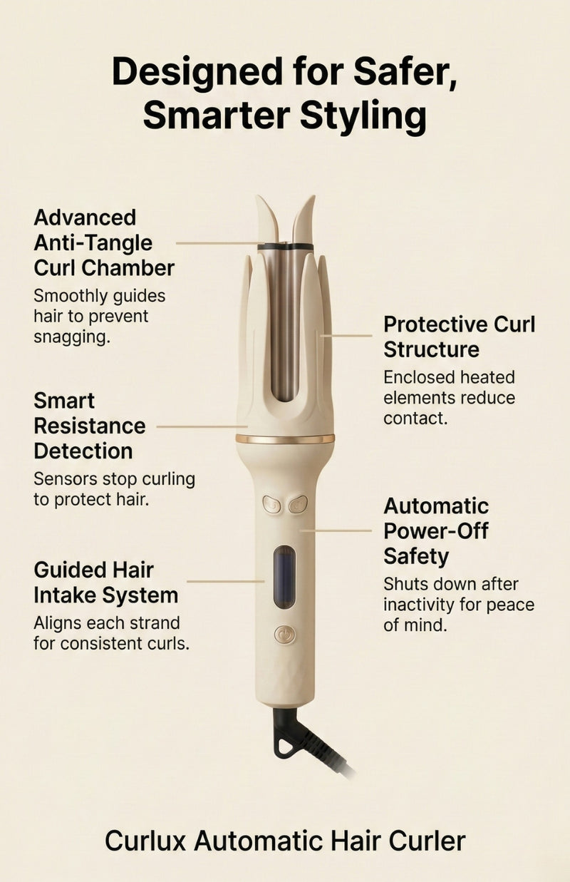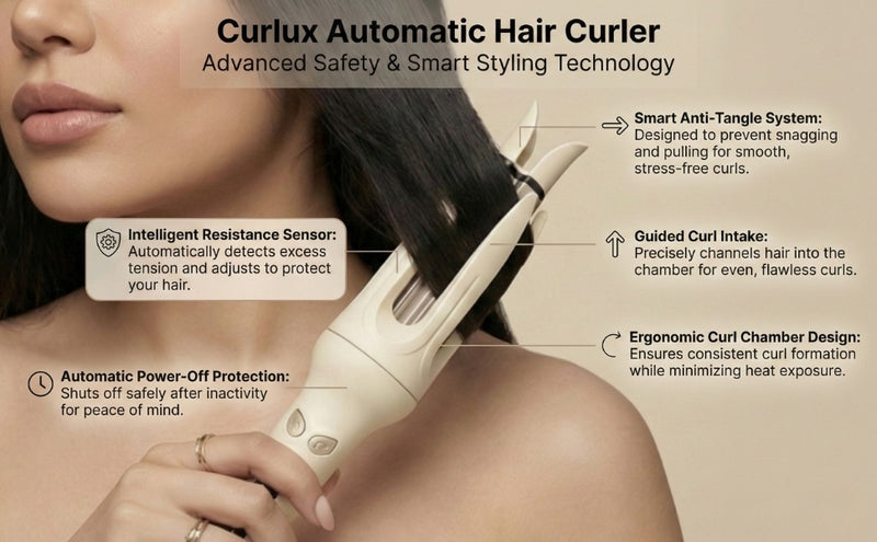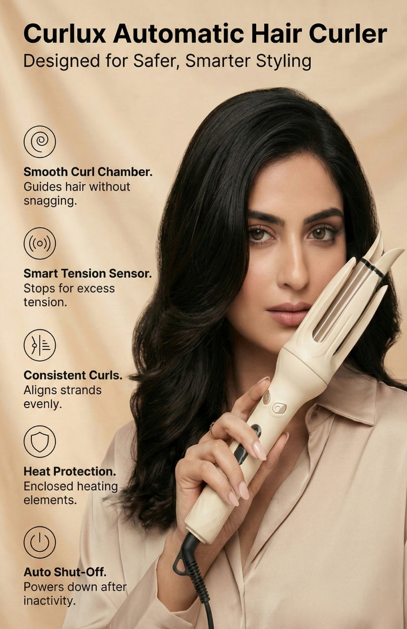 Signaxo Curlux Automatic Curling Iron features a rotating barrel that creates beautiful curls quickly and evenly. Its heat-control settings, anti-tangle mechanism, and smooth ceramic coating deliver frizz-free, long-lasting curls effortlessly.