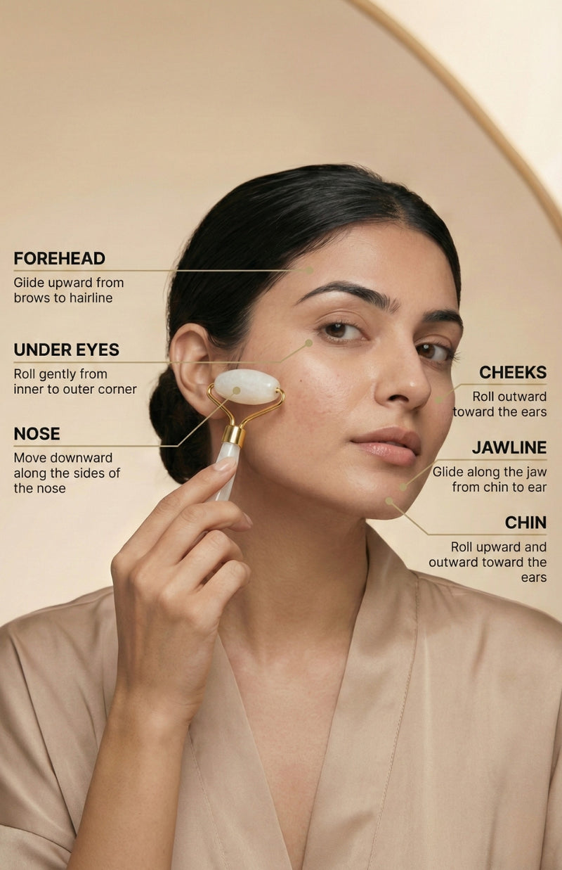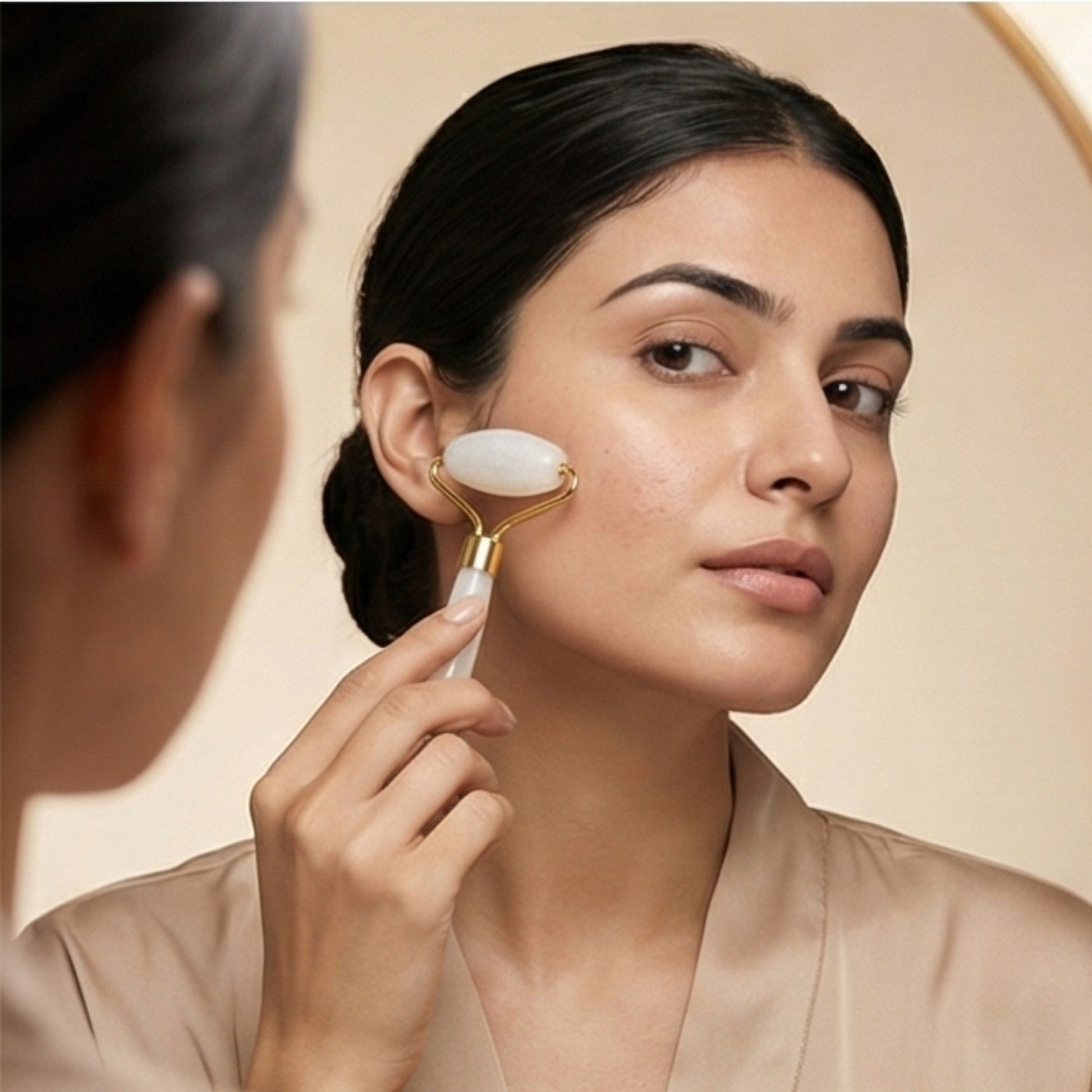 Integrating traditional skincare techniques with modern design, the roller and gua sha tool work synergistically to improve blood circulation, reduce puffiness, and enhance overall skin radiance. Its refined aesthetic adds a sophisticated element to your beauty regimen.